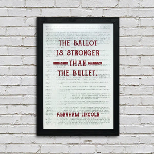"The Ballot is Stronger than the Bullet." - Abraham Lincoln. This work of art includes the great Abe Lincoln quote on top of the Declaration of Independence in silver ink. Very iconic and yet ironic given the history. This particular print is made in patriotic red. Also available in several other colors.