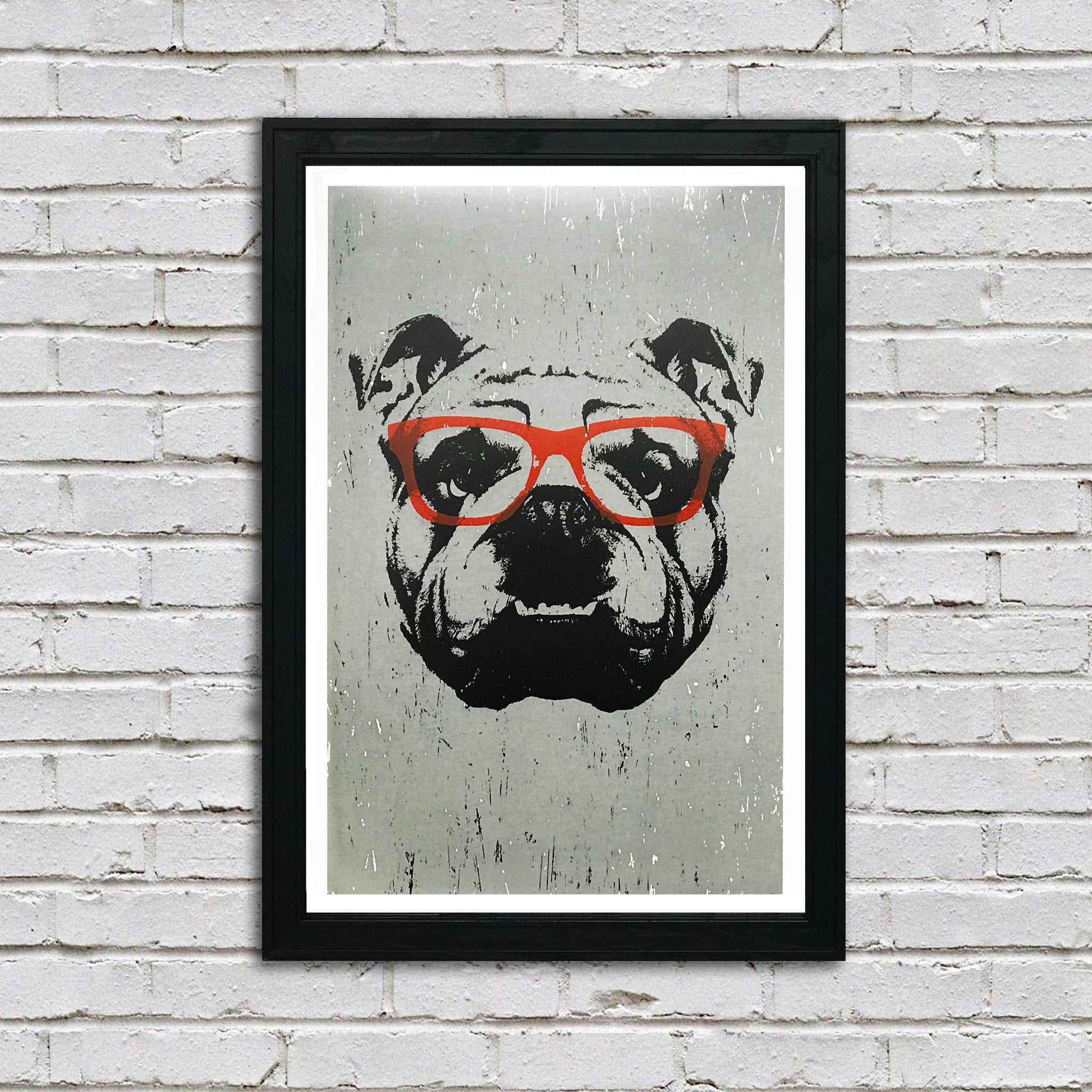 Our handcrafted English Bulldog Art Poster / Print with Orange Glasses is perfect for dog lovers! Made in rich black, electric orange and slate grey ink. Distressed look gives the print a modern yet vintage look.
