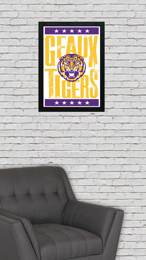 The vintage letterpress design looks stunning on your wall and makes the perfect gift for the Tigers fan in your life. This print is handcrafted in iconic LSU Tigers official colors. Our poster is perfect for your home office, LSU man cave or game room.