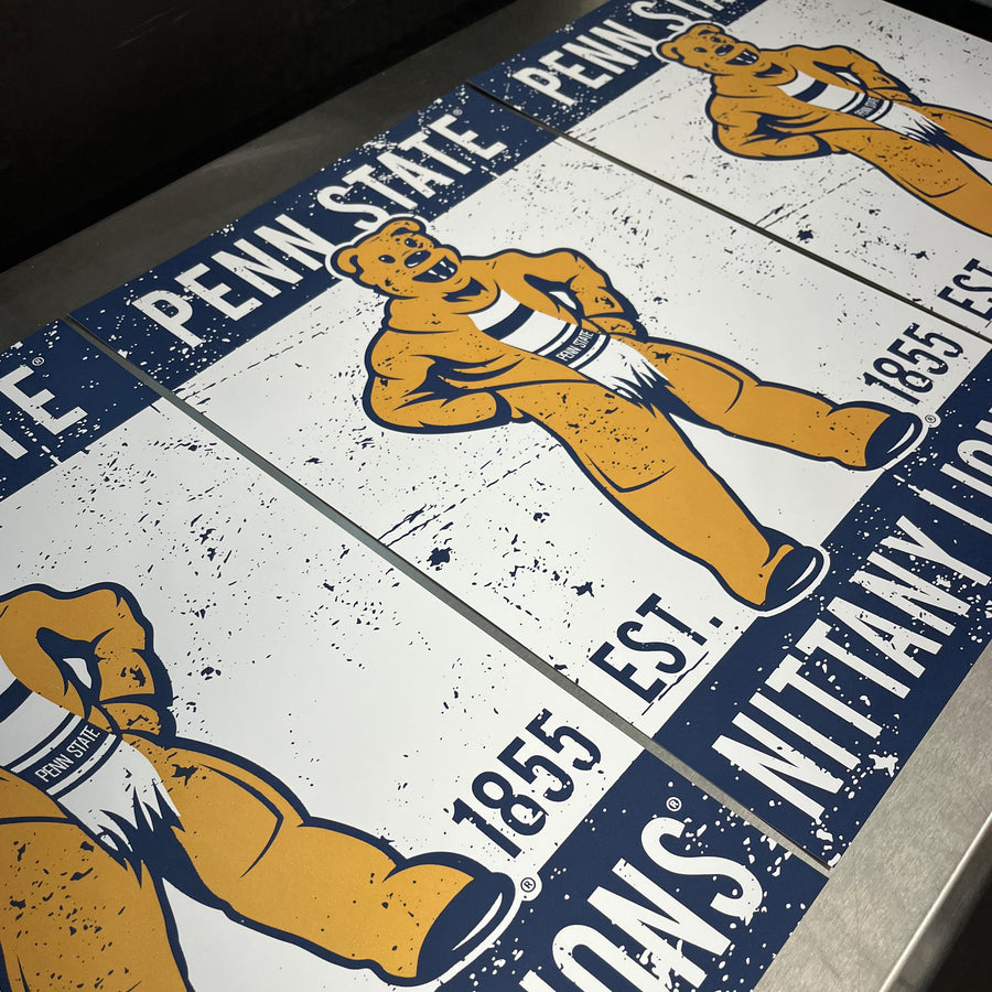 The blend of the Nittany Lion mascot logo using a vintage style layout makes this a must have print. This handcrafted Penn State University print art makes the perfect gift for the PSU fan in your life. Our poster looks great in any office, game room, bedroom, rec room, man cave, Penn St. rooms, dorms and other living spaces.