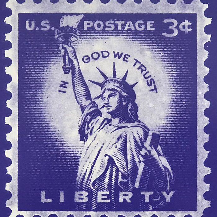 1954 US Stamp screen print of the 3 Cent Statue of Liberty. Part of the Liberty Series from 1954-1961 the series includes United States founders, presidents and historic landmarks. Our Statue of Liberty Poster is made in blue ink to match the original stamp. A truly beautiful conversational piece for philatelists.